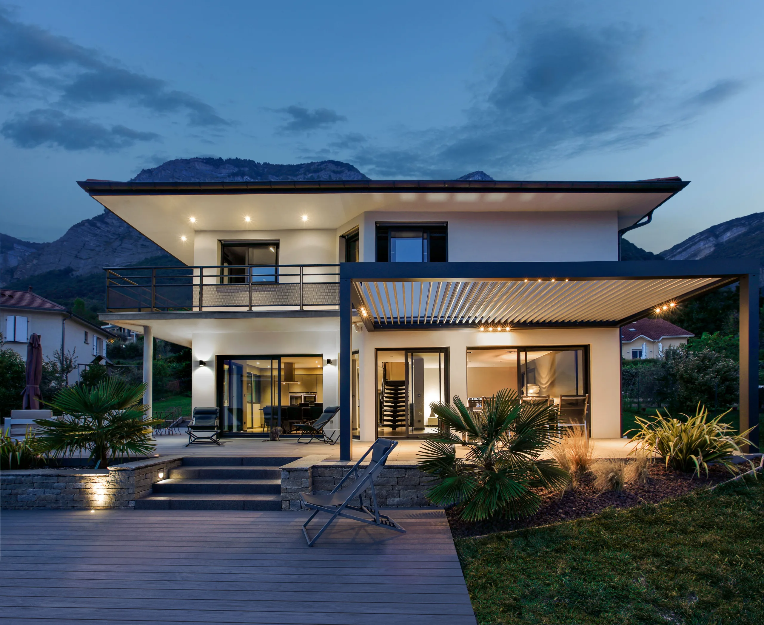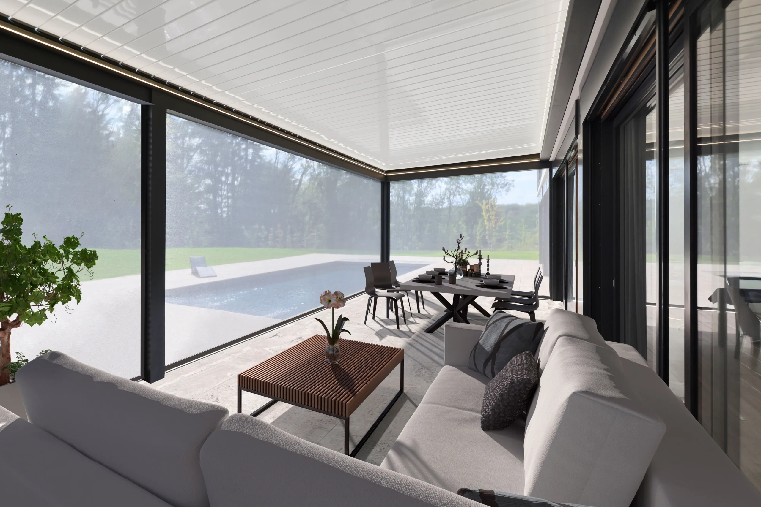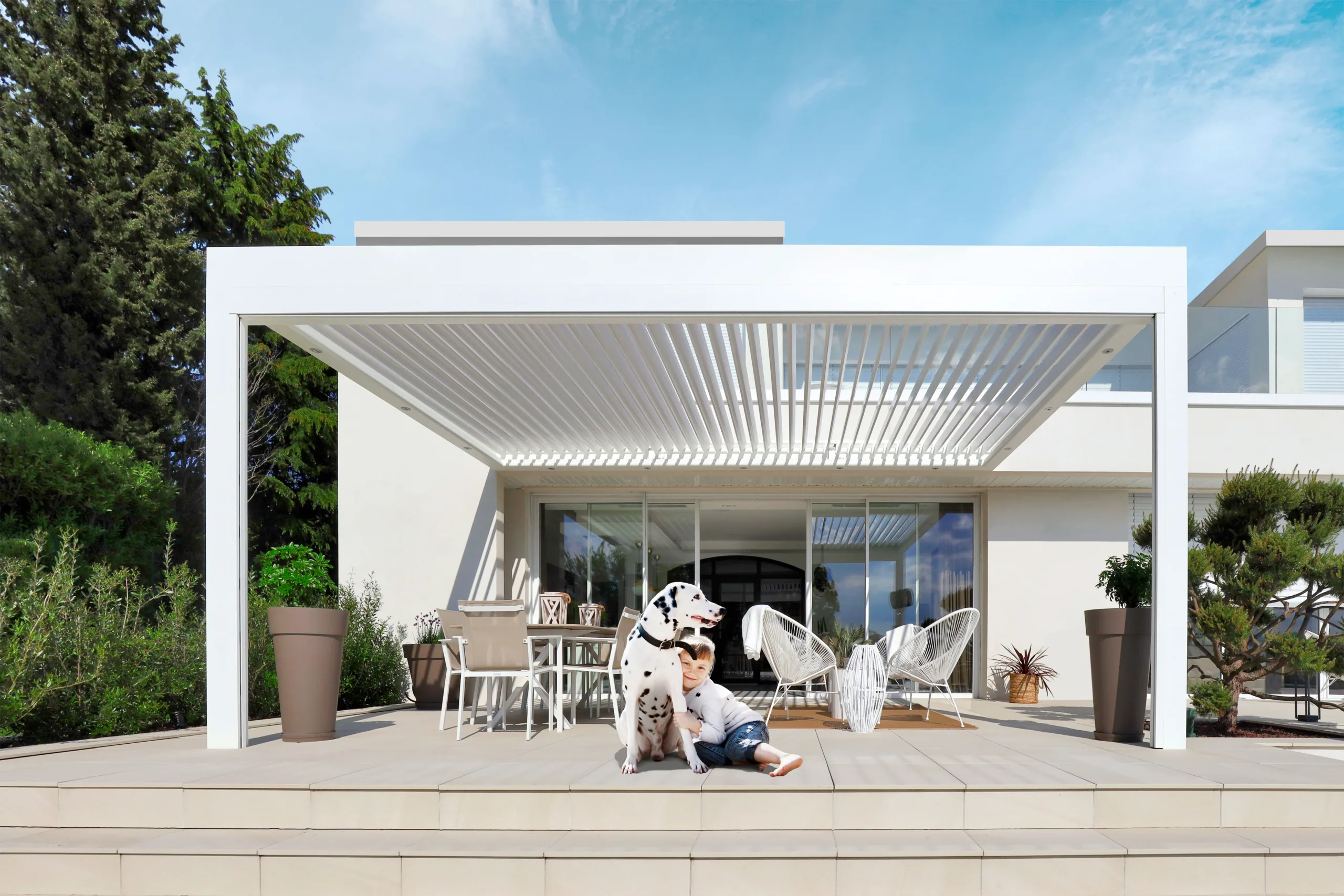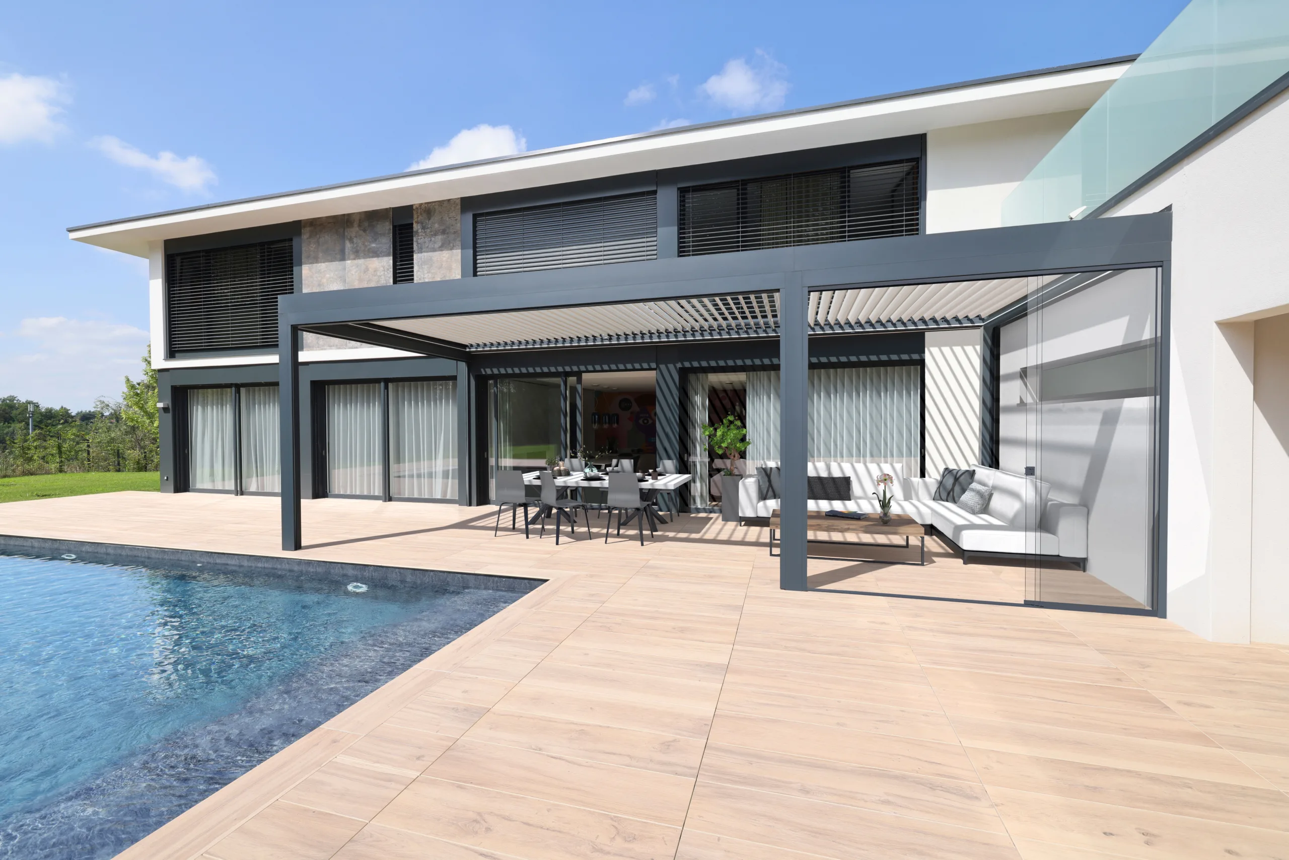 Premium-Lamellendach mit schwenkbaren Aluminiumlamellen, smarter Steuerung und modularen Erweiterungen. Ideal für Terrassen, Gastronomie und Outdoor-Living.
